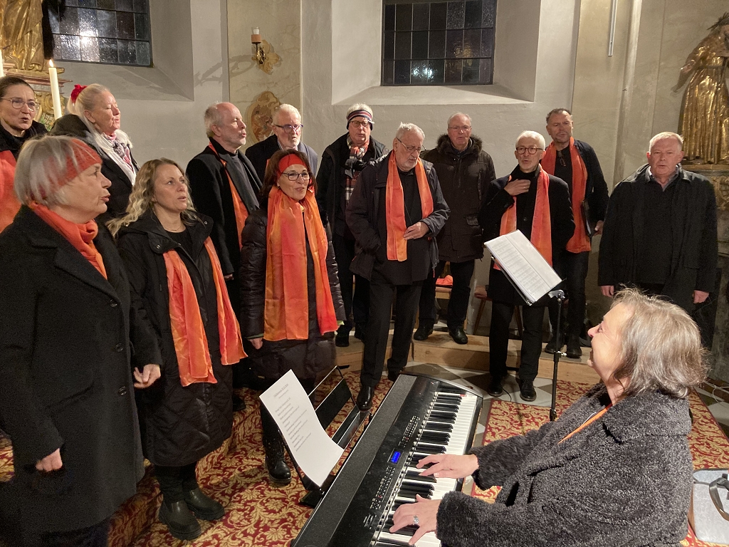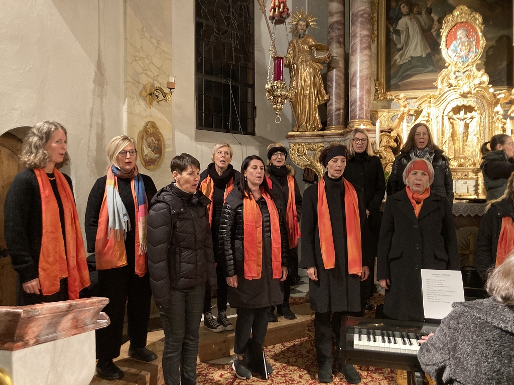 Die SängerInnen von Stimmquadrat waren gleich mehrfach stimmlich gefordert: Wie jedes Jahr sangen wir auch heuer eine Messe zu Ehren der heiligen Cäcilia, der Schutzpatronin der Sänger, Musiker und Dichter, der Organisten, Orgelbauer, Instrumentenmacher und nicht zuletzt der Kirchenmusik, deren Gedenktag am 22. November gefeiert wird. Wir gestalteten die Cäciliamesse am 23.11. 2024 um 19 Uhr in der Pfarrkirche Obsteig, wobei das Programm noch beim Einsingen kurzfristig geändert wurde… und die Messe leider nicht allzu gut besucht war…Erstmals war Albert Knapp für die Klavierbegleitung dabei. Danach kehrten wir im Restaurant / Pension Alpina in Obsteig noch zu einem gemütlichen Ausklang ein.