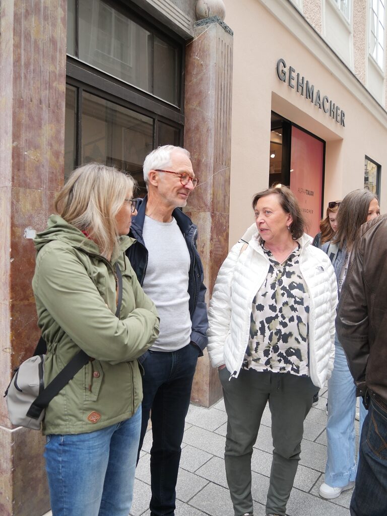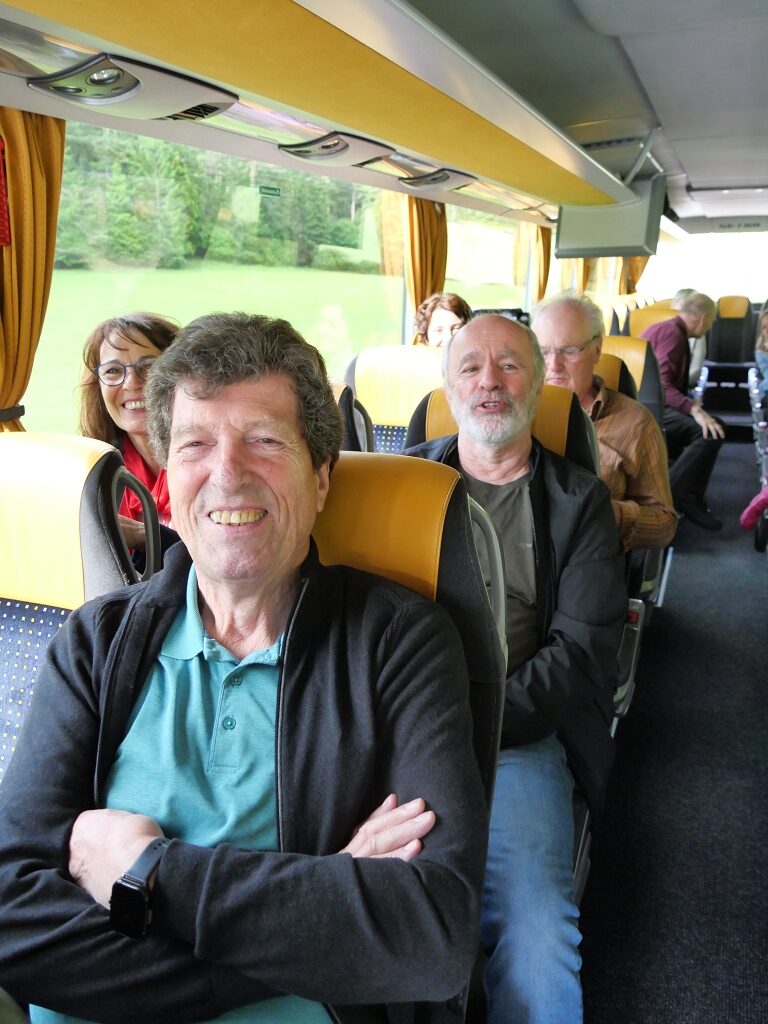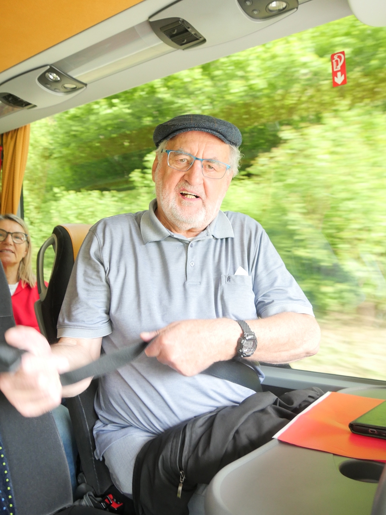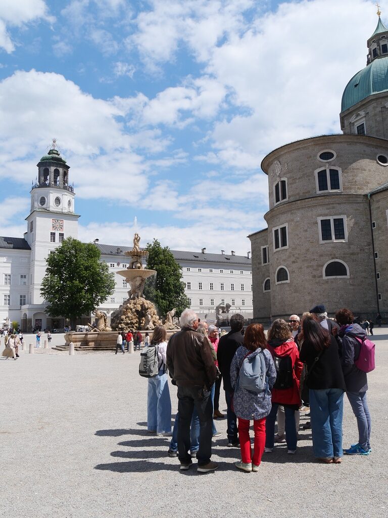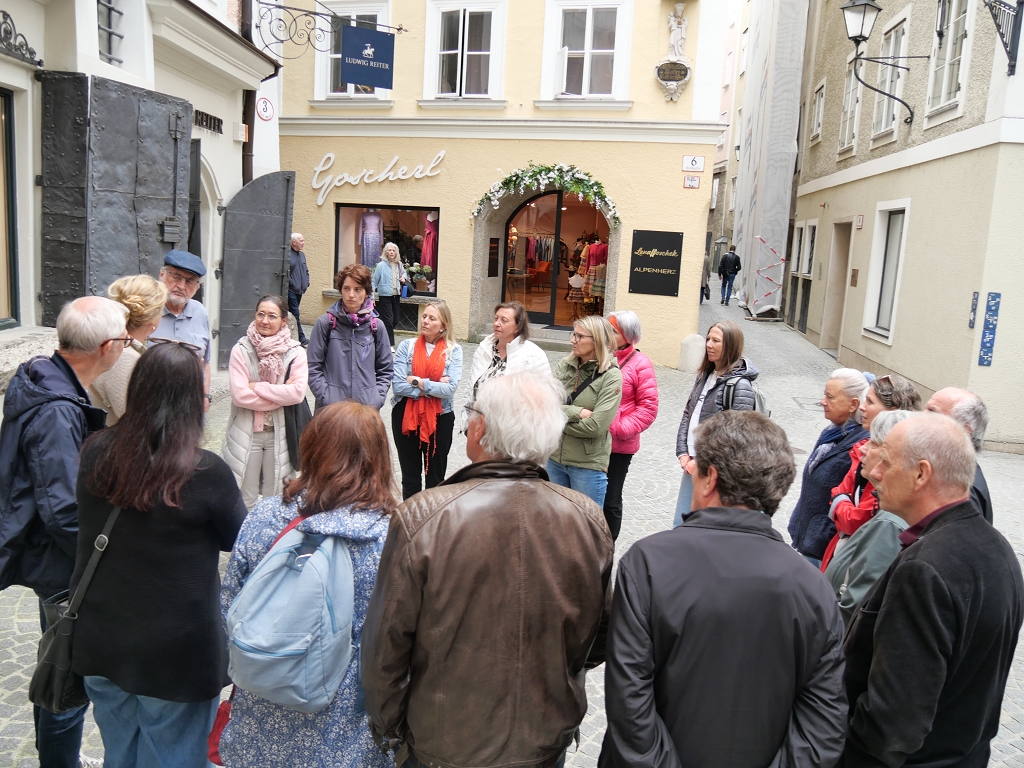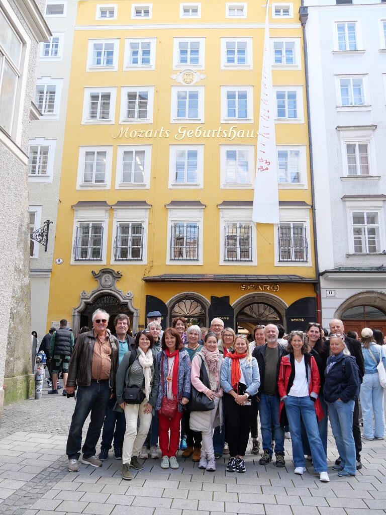 Ausgerüstet (u.a.) mit musikalischem Reisegepäck, wie Noten, Chormappe, schwarzer Kleidung und orangem Schal bestiegen wir am Morgen des Samstag, 24.5., den Reisebus bei den Zustiegsmöglichkeiten Gemeinde Obsteig, Barwies Kirche und Mieming Gemeindehaus. Da ein starkes Reisewochenende angesagt war, entschieden sich unser Busfahrer und unser Reiseleiter Heribert für die Variante über das kleine deutsche Eck und Lofer, um pünktlich zum Mittagessen in Salzburg Stadt anzukommen, was auch perfekt geklappt hat. Nach einem Mittagessen in der »Goldenen Kugel« wurden wir von unserer Reiseführerin ebendort abgeholt und erlebten eine interessante und anekdotenreiche Führung durch die Innenstadt, samt Fotoshooting vor dem Geburtshaus von Wolfgang A. Mozart.
